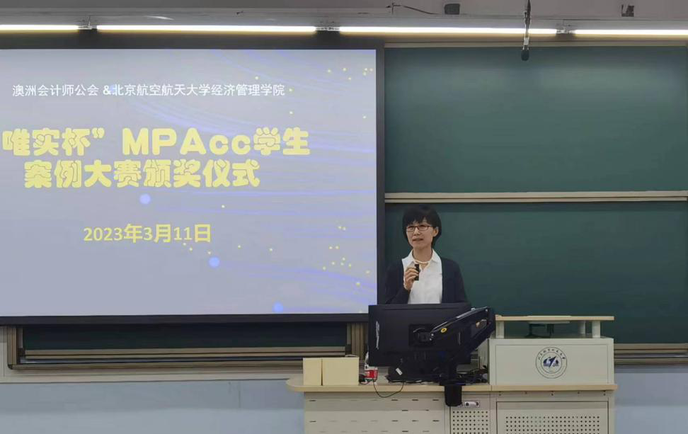 “向阳草木青,明媚春光暖,春天的美,俯拾皆是。”3月11日晚,北航经管学院“唯实杯”MPAcc学生案例大赛颁奖仪式在学院路教学区5号楼112教室隆重举行。2021级、2022级MPAcc研究生共百余人参加活动,澳洲会计师公会北京代表处首席代表孟文静女士、华北区委员会会长彭飞先生、财政部中国注册会计师协会国际及港澳台事务部主任宋祉健先生、中国铁建财务有限公司副总经理薛志辉先生、北京奔驰汽车有限公司战略与内部控制高级经理左晓帆女士、北航经济管理学院副院长牟晖副教授、周宁教授、MPAcc教育中心副主任任晖老师出席颁奖仪式。仪式由经济管理学院MPAcc教育中心主任白明副教授主持。